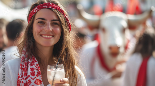 Woman Smiling with Red Scarf and Glass of Sangria at San Fermin Festival – Joyful Female Attendee in Traditional White Outfit Enjoying Spanish Culture and Festive Street Event