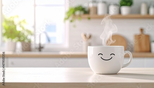 Taza de café animada con guiño sobre la encimera de la cocina con vapor de café, taza blanca con diseño minimalista, ambiente lúdico y amigable.