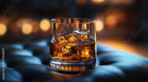 Close-up of a classic transparent glass tumbler filled with dark amber whiskey and ice cubes, sitting on a soft surface with warm blurred background lighting