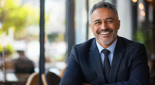 Retrato de um líder e CEO indiano ou latino de meia-idade, maduro e confiante. Empresário bonito de terno em um ambiente de escritório.