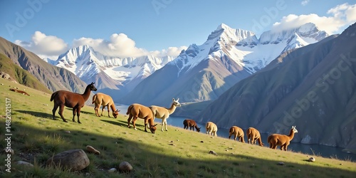 Alpacas grazing on a sunlit Andean mountain slope at dawn