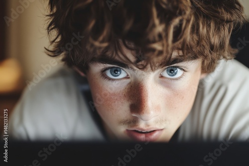 Focused teen with light eyes stares intently at screen. Use for themes of concentration, focus, and technology use.