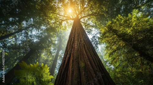 Majestic redwood tree standing tall in lush forest nature photography serene environment upward perspective