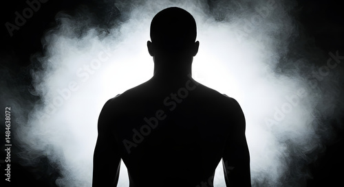 A naked dude stands with his back to the camera, silhouetted against a smoke background. He's got short, dark hair and a buff build, with his shoulders and upper back