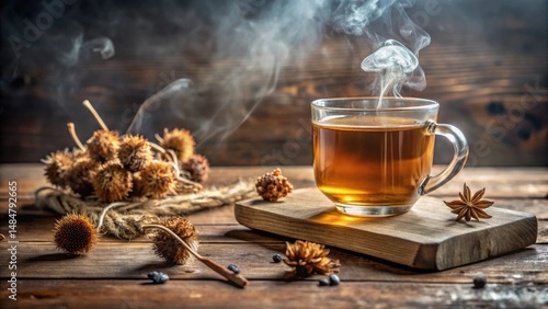 Aromatic Herbal Tea Steaming in a Glass Mug on Rustic Wooden Table