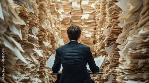 Male adult surrounded by overwhelming stacks of paperwork in a narrow office space