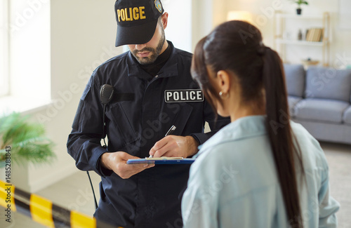 Portrait of young police man officer talking to witnesses standing at a fenced crime scene and interrogating a woman robbery victim after burglary at home. Robbery, safety of property concept.