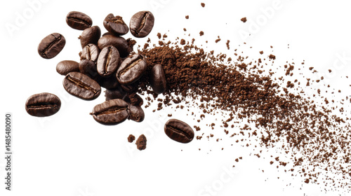 Flying coffee beans in mid air with dynamic motion roasted aromatic beans and energetic caffeine concept isolated on white background