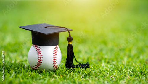 A baseball sits on the grass with a graduation cap, representing education and sports achievement