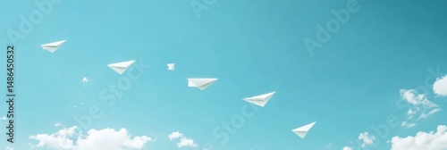 White paper airplanes soaring in a blue sky along a golden ratio curve with clouds enhancing a minimal preschool background for creative messages