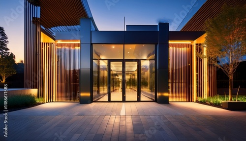 modern glass building entrance with automatic sliding doors and warm interior lighting creating a welcoming glow at dusk