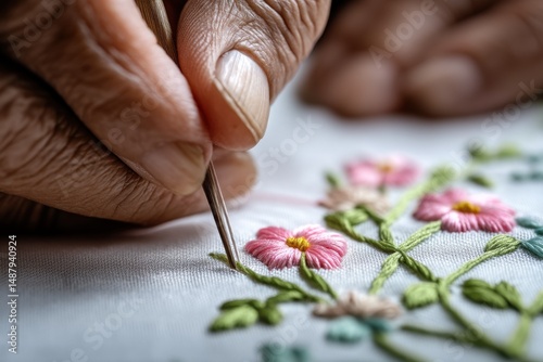 Close-up of hands skillfully embroidering delicate pink flowers and green leaves onto a white fabric, showcasing intricate needlework detail. : Generative AI