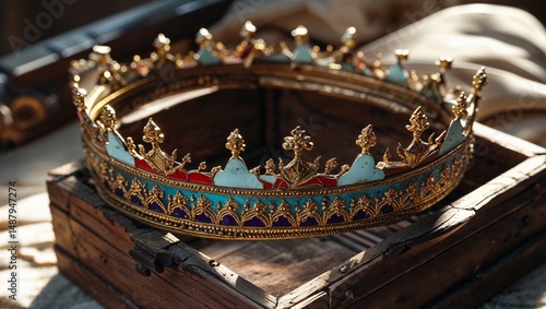 Ornate Byzantine Crown on Wooden Box, Golden Royal Symbol