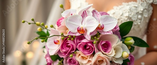 Romantischer Brautstrauß mit Orchideen, Rosen und Schleierkraut vor einer Braut in weißem Kleid. Ideal für Hochzeitsdesigns und Floristikthemen.