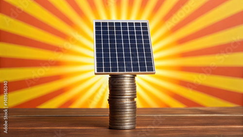 Solar Panel on Coins Symbolizing Investment in Renewable Energy and Sustainability