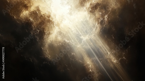 Ethereal rays of celestial light radiating from the sky, symbolizing divine presence and serenity
