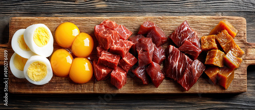 Boiled eggs and various raw meat cuts on wooden board show carnivore diet meal with fresh protein and rich nutrition