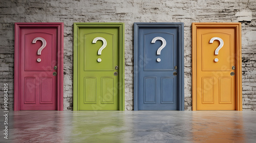 Four colorful doors with question marks, symbolizing choices and possibilities.