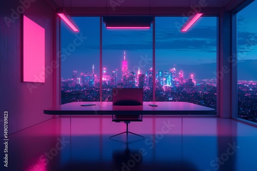 Futuristic office features a sleek design with a large desk and a computer, set against a colorful city skyline illuminated at dusk, showcasing vibrant neon lights.