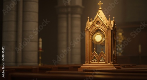 Eucharistic adoration chapel with monstrance and church pews in calm setting