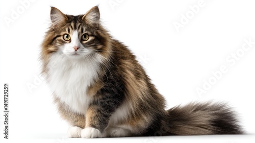 A Norwegian Forest cat with thick double coat and bushy tail, sitting with tail wrapped around its paws, centered on a white background, sharp focus, studio-lit, realistic detail