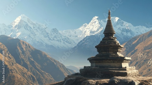 Serene Mountain Landscape with Ancient Stupa Under Clear Blue Sky