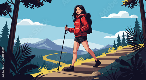 Summer healthy sports lifestyle: Cartoon illustration of a woman hiking with a backpack and trekking pole on a scenic mountain trail overlooking a river. Active outdoor adventure