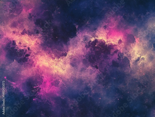Abstract nebula painting in deep space showing cosmic clouds of gas and dust with vibrant pink and gold colors