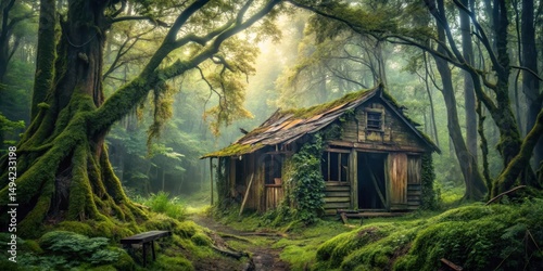 Creepy abandoned shack hidden deep in the forest with overgrown vegetation and twisted tree branches, eerie, isolated