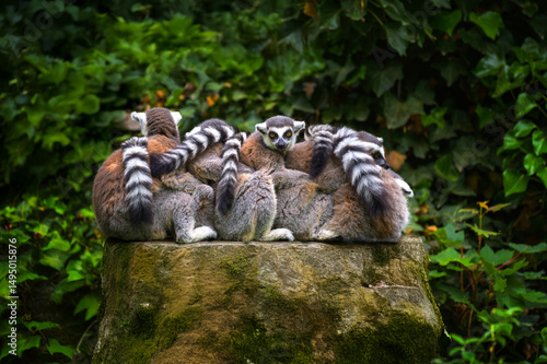 A group of ring-tailed lemurs sits closely huddled on a sawn-off tree stump surrounded by dense greenery.