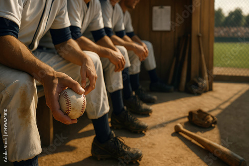 close-up of the lower half of a baseball team sitting side by side in a wooden dugout during a warm summer afternoon