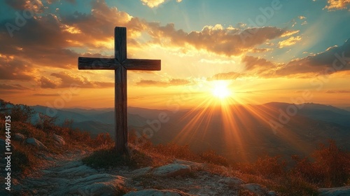 Wooden cross on a mountain ridge at sunset with sun rays breaking through colorful clouds over distant hills