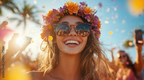 Joyful young woman wearing sunglasses and a colorful flower crown smiling brightly at an outdoor festival under a sunny sky with blurred crowd and flower petals in the air
