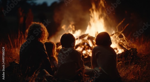 Children Gathered Around Campfire at Dusk, Representing Warmth, Togetherness, and Family Bonding During Summer Vacation, Ideal for Lifestyle and Travel Campaigns : Generative AI
