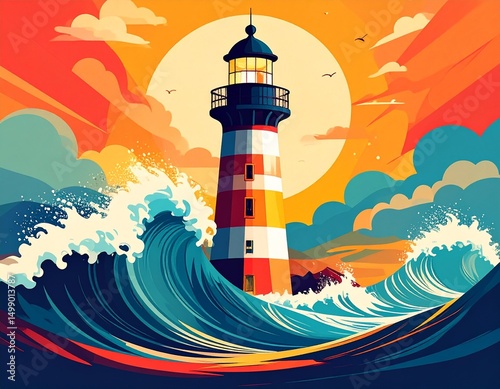 Latarnia morska. Fale rozbijające się o latarnię morska. Ilustracja, grafika