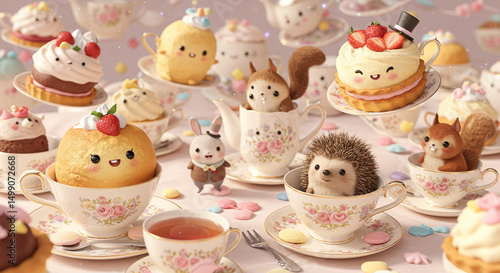 Enchanting tea party scene featuring kawaii desserts and adorable animal characters nestled in delicate floral teacups and teapots