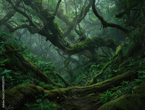 Zarośnięty las, splątane gałęzie, mgła, głębia, tajemnica