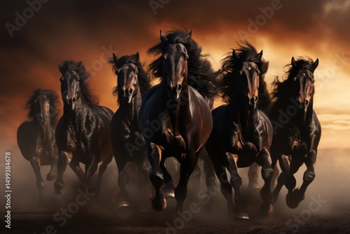 Stado ciemnych koni galopujących przez zapylony krajobraz o zachodzie słońca, dynamiczne ujęcie.