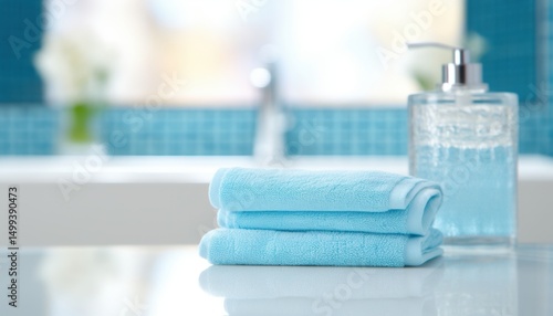 Niebieskie ręczniki i dozownik do mydła w łazience