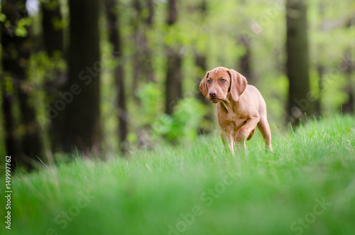 Ten week old puppy of vizsla dog in the forrest in spring time