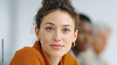 A young woman with curly hair smiles warmly, exuding confidence and friendliness