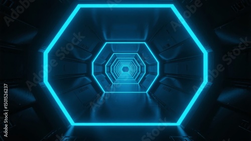 A futuristic tunnel with glowing blue neon lights forming octagonal shapes
