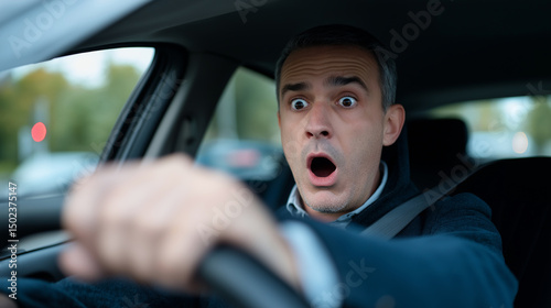 Shocked man gripping the steering wheel tightly while driving, expressing fear or surprise in a traffic situation.