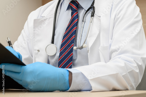 Lekarz siedzący za biurkiem w czasie wizyty pacjenta, wywiad chorobowy i wypisywanie recepty, diagnostyka,
