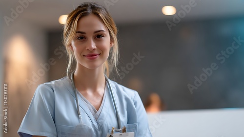 Portrait of a Smiling Female Nurse in Light Blue Scrubs in a Hospital Setting