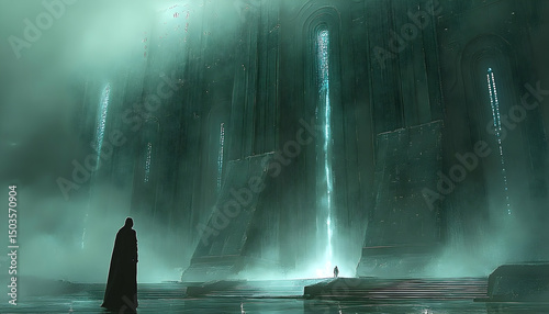 Foggy, imposing structure with figures under streaming light, reflects in water