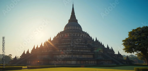 The Great Stupa at Sanchi under soft afternoon light, ancient stone carvings on the toranas, green manicured lawns surrounding the dome, clear blue sky, historical serenity, Buddhist ambiance.