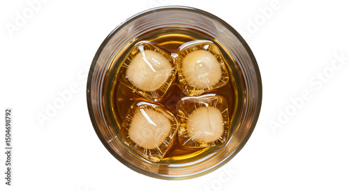 Whiskey drink with ice cubes in glass top view alcoholic beverage cocktail refreshment on black background on transparent background