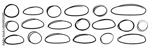 Line brush pen highlight round oval frame set. Hand drawn marker, pen scribble stroke line oval frame. Brush round frame for text highlight ellipse. Grunge scratch style set. Vector illustration