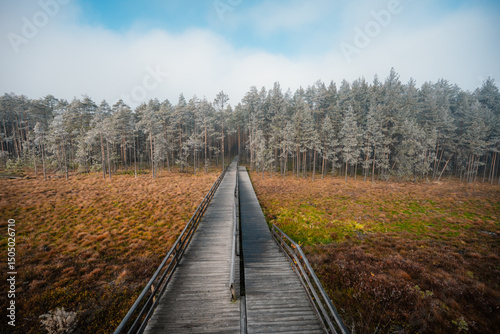 A wooden walking misty path in Bor na Czerwonem nature reserve in Nowy Targ in Poland